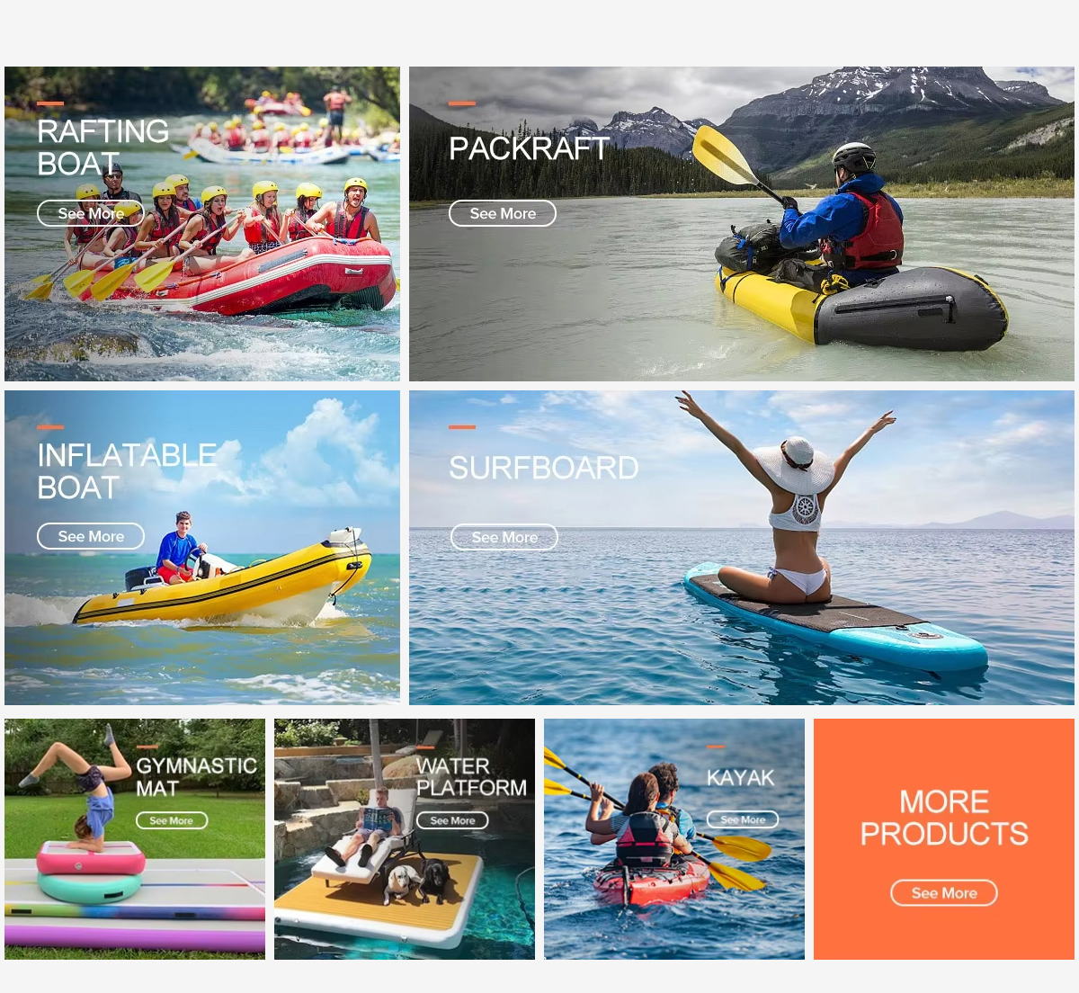 Productos principales:Tablas de remo de pie, kayak, plataforma de agua, pista de aire de gimnasio, bote inflable